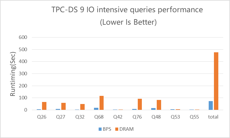 Spark SQL集群对比测试结果说明: 数据cache后,BPS整体性能是DRAM的6.5倍。BPS顺利获得OAP缓存了9个I/0需求高的SQL全部数据,而DRAM受服务器内存资源的限制测试数据不能全部放在内存中,部分数据落在磁盘上,导致Spark数据处理能力无法充分发挥。