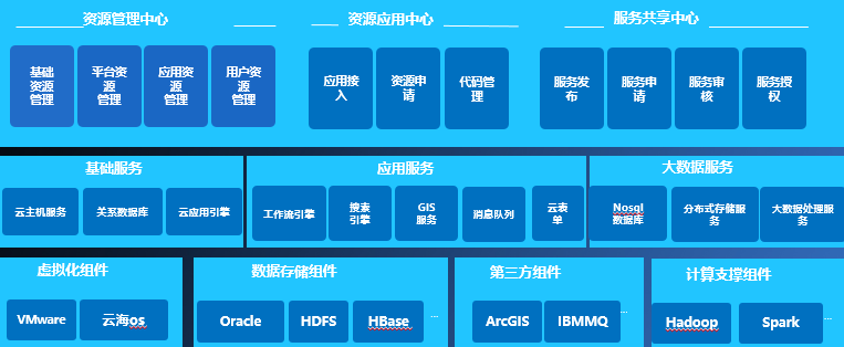 将计算资源、存储资源、网络资源等物理资源进行整合,按照云服务模式和云架构建立共享资源池,形成云基础支撑环境,满足海量国土数据存储、高并发用户访问和信息共享查询的需要。