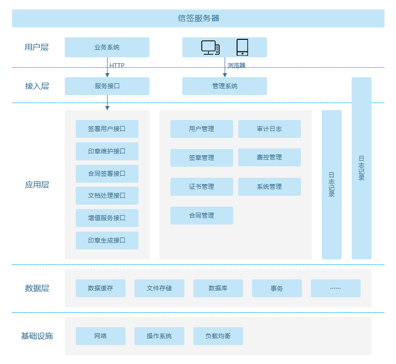 本系统底层采用Java开发语言,通讯协议采用Http传输模式,能够完美的与各种开发语言(Java、PHP、.NET、C、C++、Python)的系统接入 操作界面基于浏览器的模式,能够无缝嵌入PC、APP、小程序、公众号中实现可视化的电子合同签署 在给予各种签署服务接口的基础上,系统还给予配套的管理服务,实现智能化的管理电子合同数据 系统能够运行于windows及linux系统中,顺利获得数据库的备份、数据的加密,负载均衡保障整个系统服务的安全、稳定