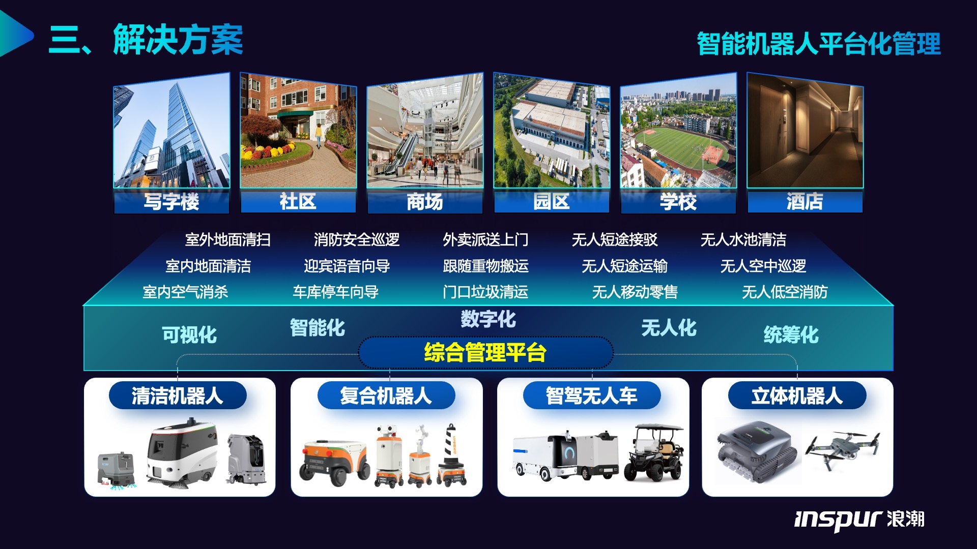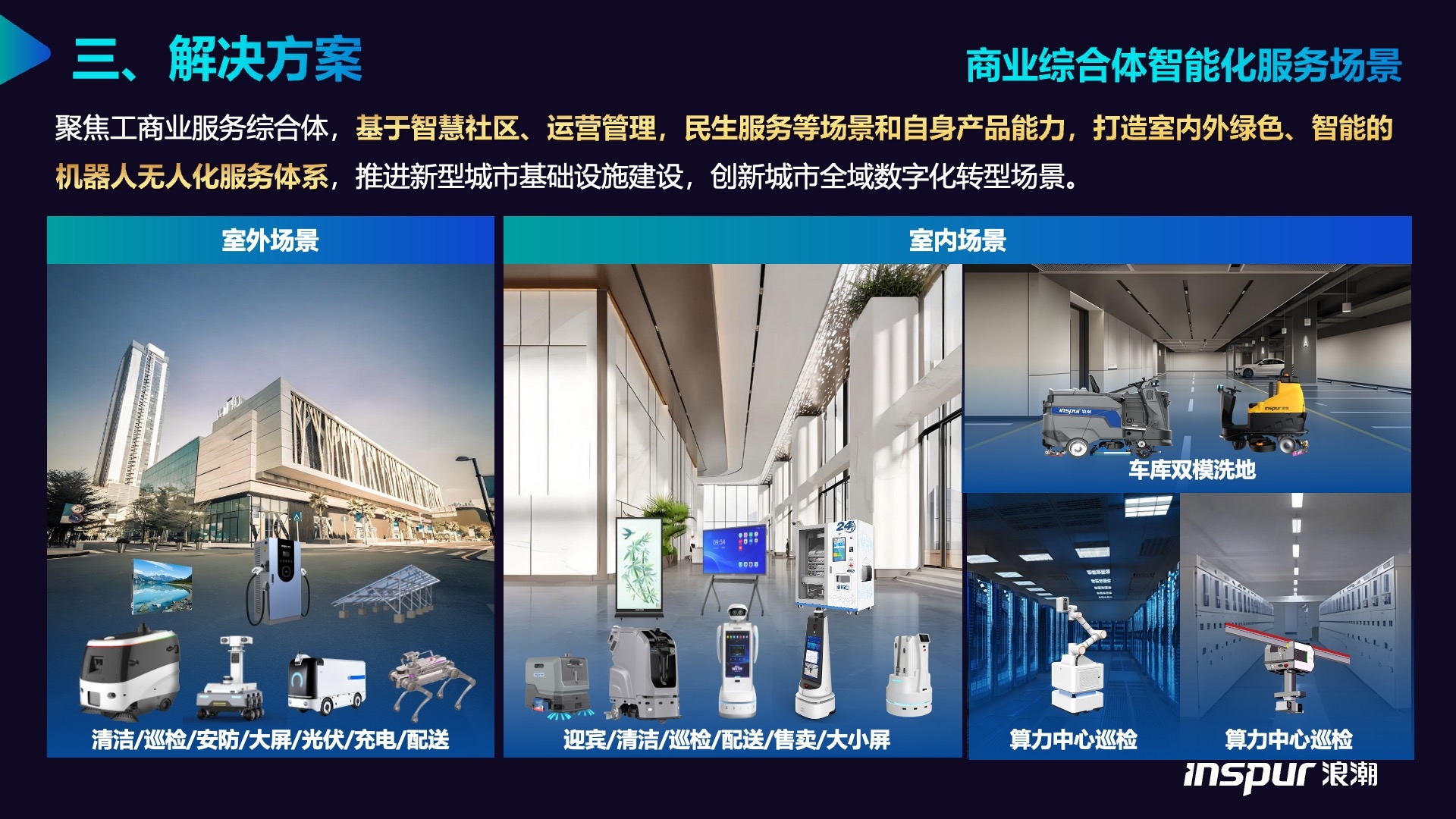 聚焦工商业服务综合体,基于智慧社区、运营管理,民生服务等场景和自身产品能力,打造室内外绿色、智能的机器人无人化服务体系,推进新型城市基础设施建设,创新城市全域数字化转型场景。