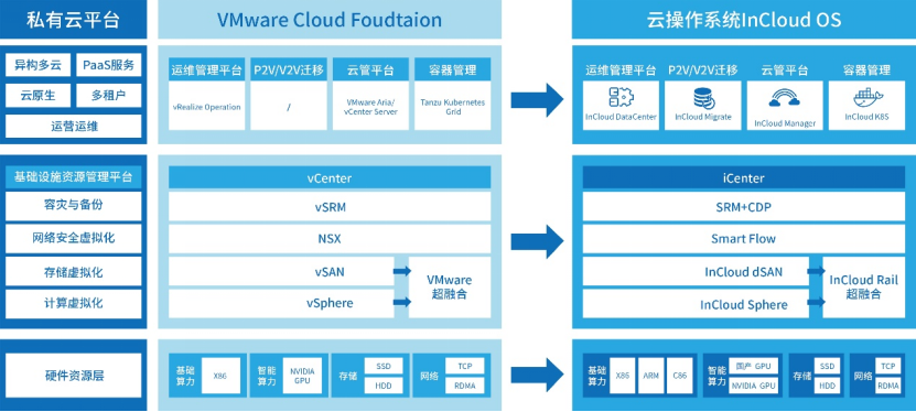 4. 智能高效,统一运营运维:异构云平台统一纳管,实现VMware便捷运维,统一管理,云资源自动调度,应用级异构编排,租户运营,计量计费,流程管理。